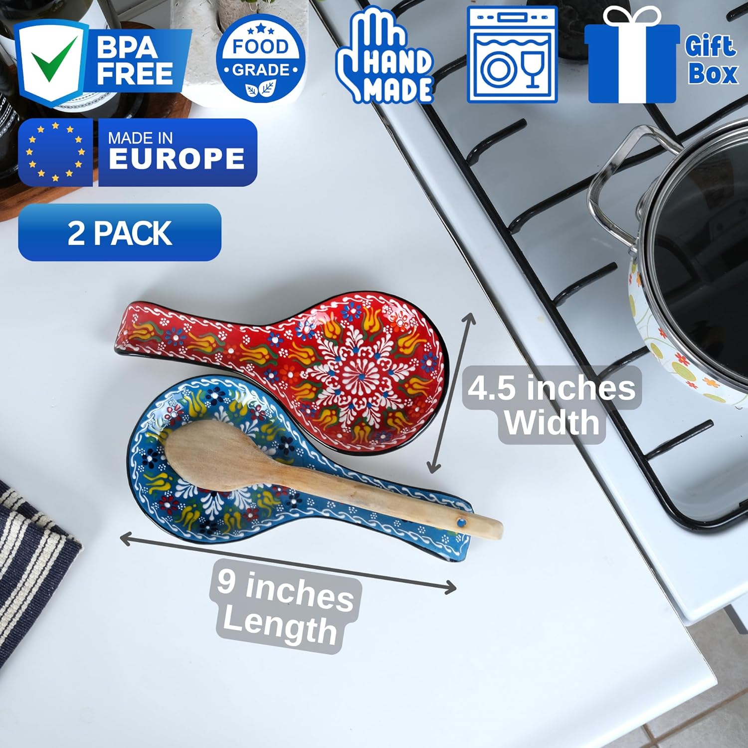 BCS Spoon Rest Set of 2 - Ceramic Spoon Holder for Stovetop & Kitchen Counter - Dishwasher Safe Handmade Kitchen Utensil (Blue-Red 4.5” W x 9" L)