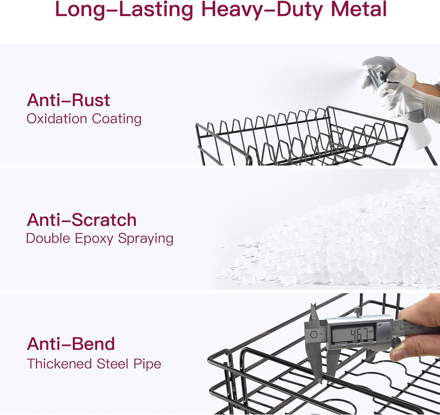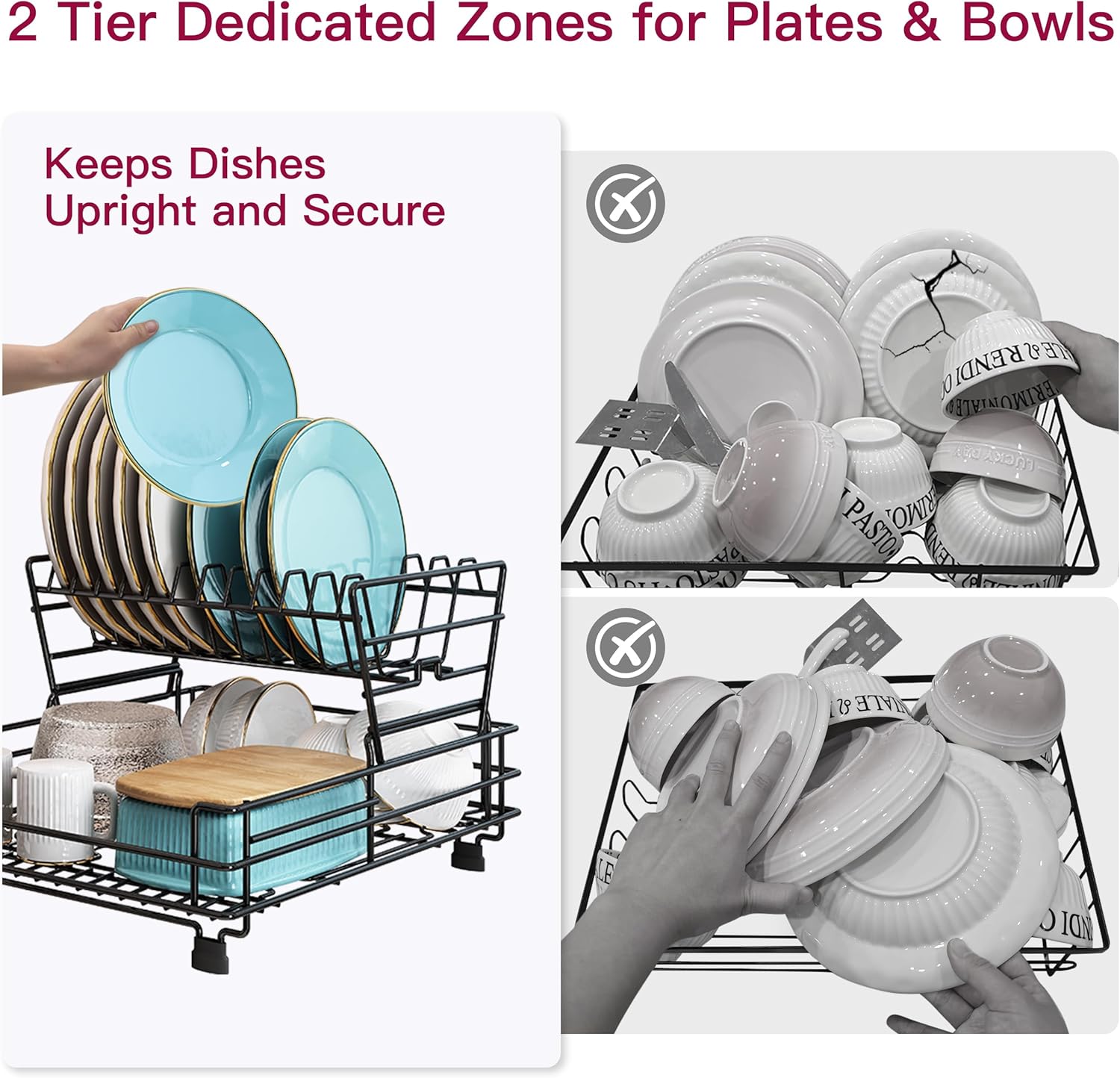 BOOSINY 2 Tier Black Large Stainless Steel Dish Drainers Drying Rack for Kitchen Counter with Drainboard, Rust Proof Metal, Space Saving, Modern Aesthetic, Compact Plates Strainers with Extra Mat