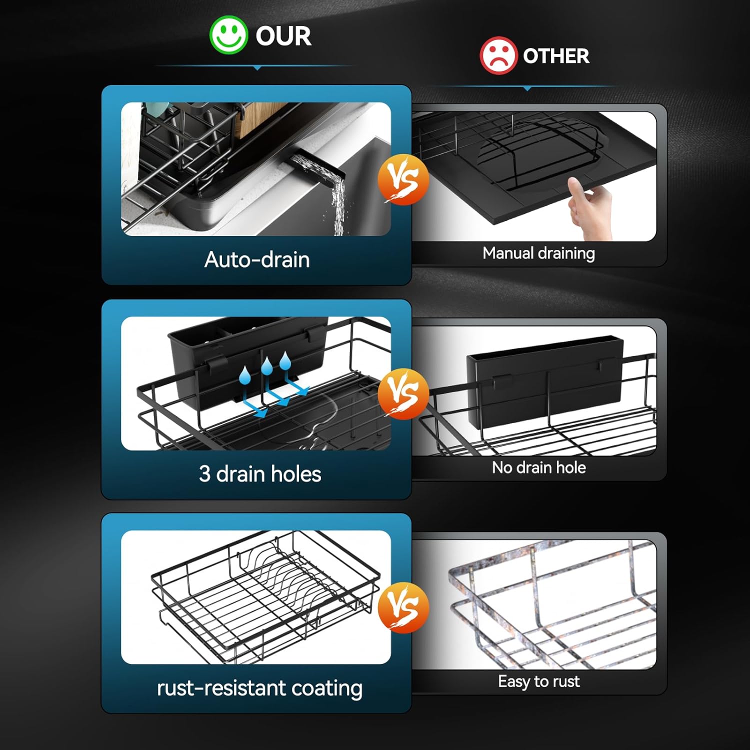 Dish Drying Rack - Expandable Rack, Large Capacity Dish Drainer for Kitchen Counter, Rust-Proof with Utensil Holder, Black