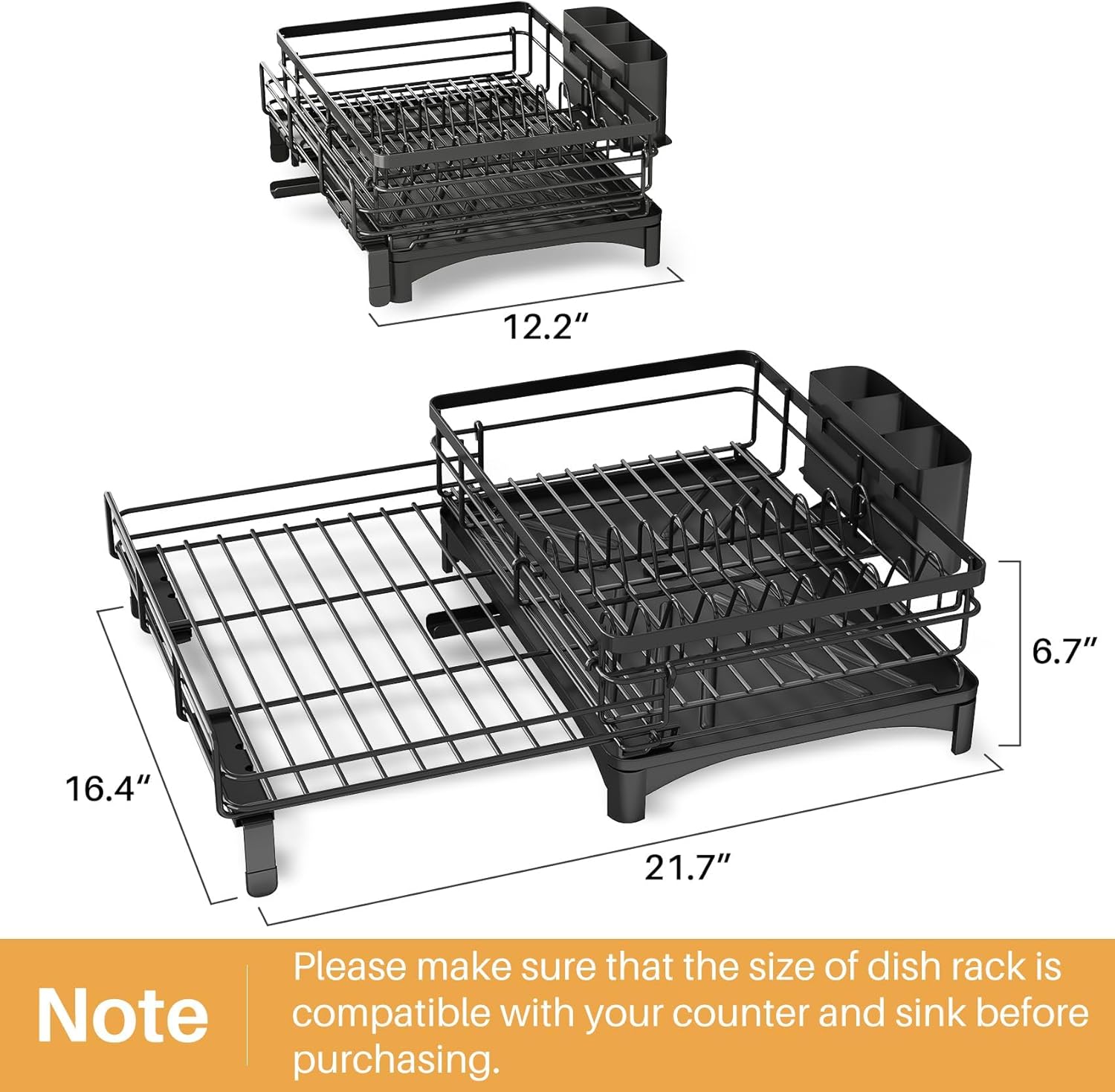 Dish Drying Rack - Extendable Dish Rack, Large Sink Drying Dish Drainer for Kitchen Counter, Stainless Steel Dish Strainer with Utensil Holder (Black)