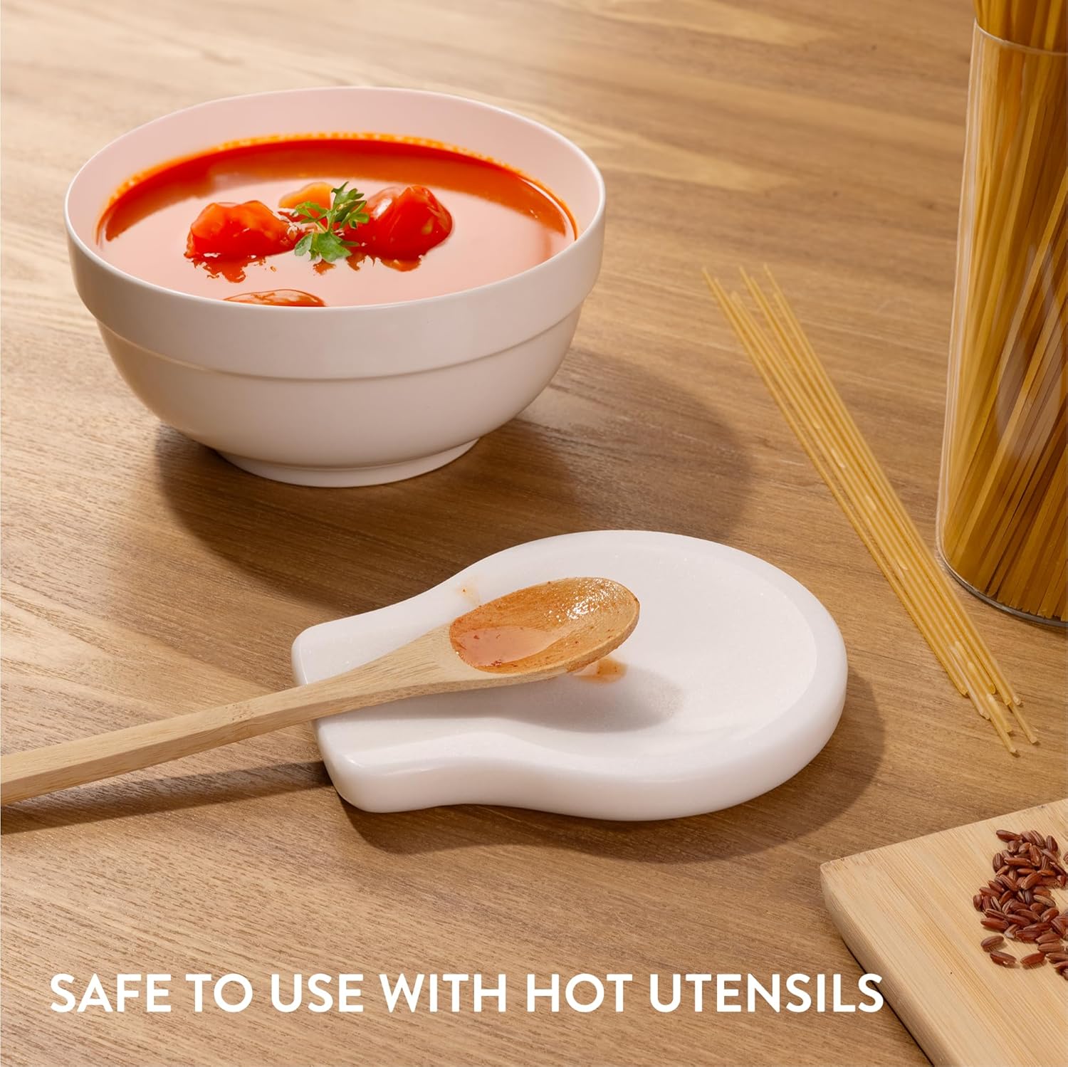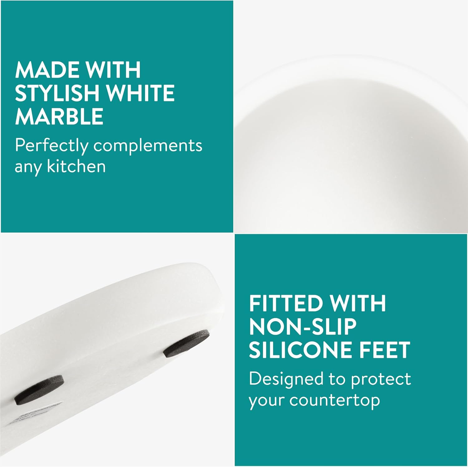 Elevate your kitchen with this pack of two marble spoon rests. Crafted from high-quality snow white marble, they're stylish and practical. The non-slip silicone feet protect your kitchen top, while the flat base keeps your utensils stable making them the perfect place to rest your metal spatulas, ladles, cooking spoon or teaspoon. With this cooking spoon rest, you'll be protecting your countertop. The heat tolerance and versatile design make these spoon rests a must-have kitchen accessory.