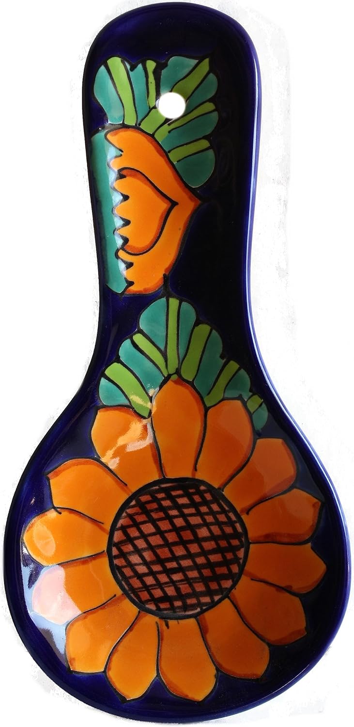 Are you tired of spills on your counter-top because of spoons with food left over it? Not anymore. This Talavera ceramic spoon holder will keep them away from messing up with your counter-top. The design on this one is colorful, showing a big sunflower with some green leaves and cobalt blue background. When not in use it can be hung using a little hole that has on the narrower side.