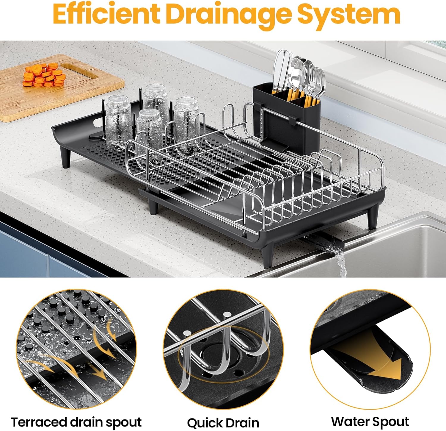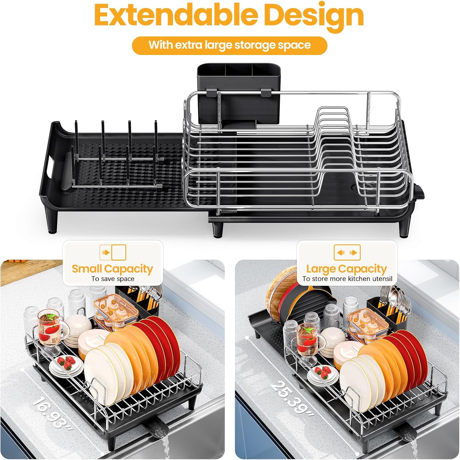TOOLF Expandable Dish Rack, Dish Drying Rack for Kitchen Counter, Foldable Dish Dryer Rack, Stainless Steel Dish Drainer Racks with Cutlery Holder, Collapsible Dish Drying Racks Large Size,Black