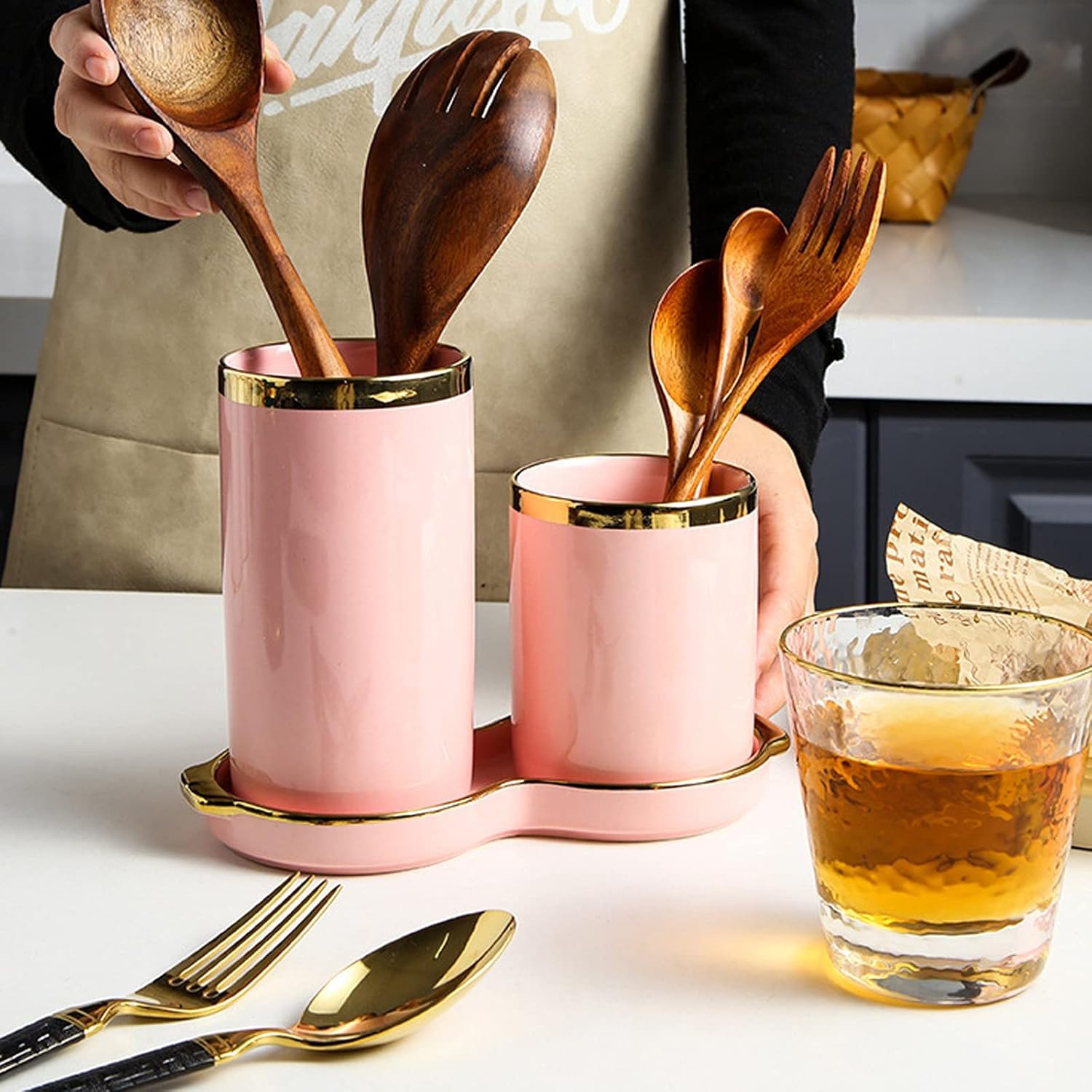 Utensil Caddy Chopstick Holder Ceramic Household, Kitchen Double-Layer Drain Chopstick Cage, Tableware Spoon and Fork Storage Tube Pen Holder Racks(Red)